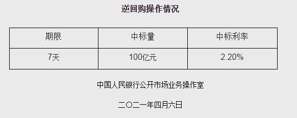 央行网站消息,为维护银行体系流动性合理充裕,2021年4月6日人民银行以利率招标方式开展了100亿元逆回购操作。