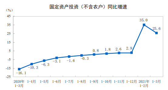 4月16日周五,国家统计局发布数据显示,1—3月份,全国固定资产投资(不含农户)95994亿元,同比增长25.6%;比2019年1—3月份增长6.0%,两年平均增长2.9%;经季节调整后与去年10—12月份环比增长2.06%。