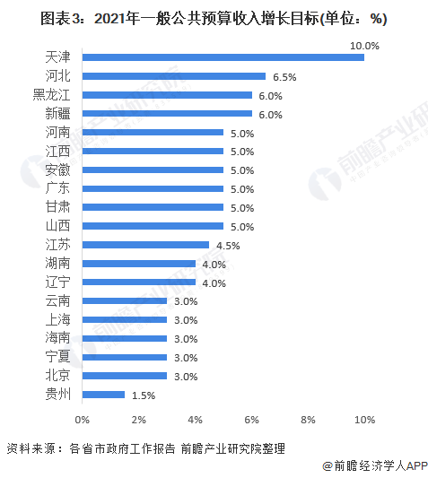 2021年各地区政府工作报告中有19个省市披露了2021年一般公共预算收入的增长目标。其中天津一般公共预算收入增长目标遥遥领先为10%;河北、黑龙江和新疆三个省份一般公共预算目标在6%以上;河南、江西、安徽等5个省份一般公共预算均为5%;贵州一般公共预算增长率目标最低为1.5%。