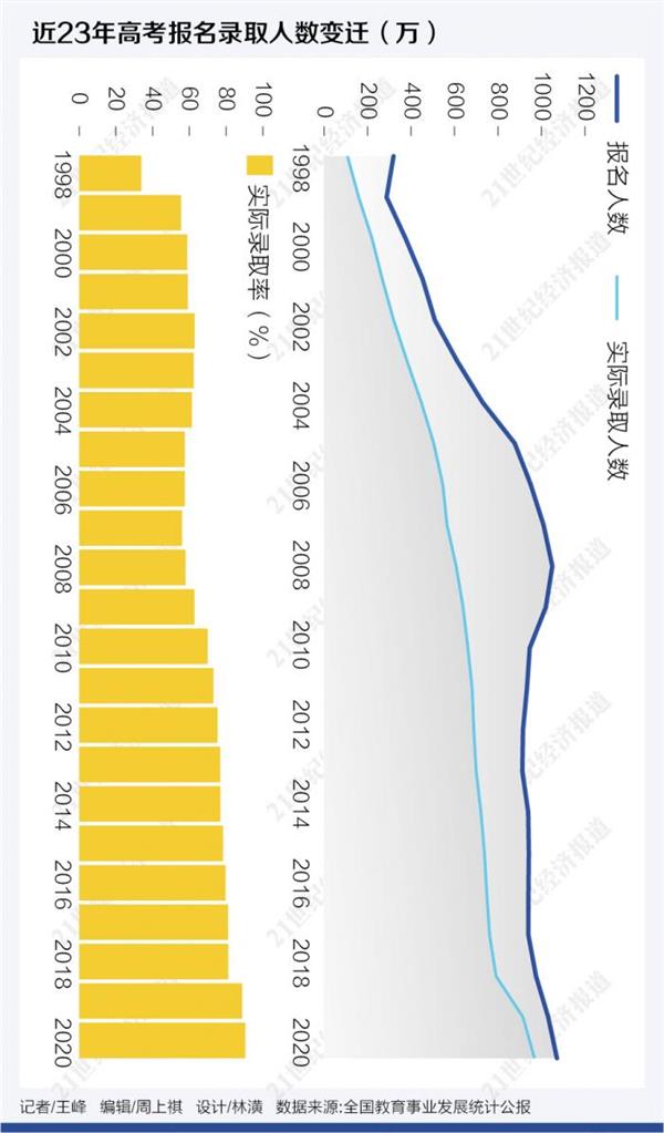 与20多年来高考报名人数变化呈现出3个周期不同的是,我国高校录取率几十年来持续提升。2020年,全国高校实际录取967.45万人,录取率首次突破90%。“大学梦”对于每名高中生来说,几乎已不是梦想。