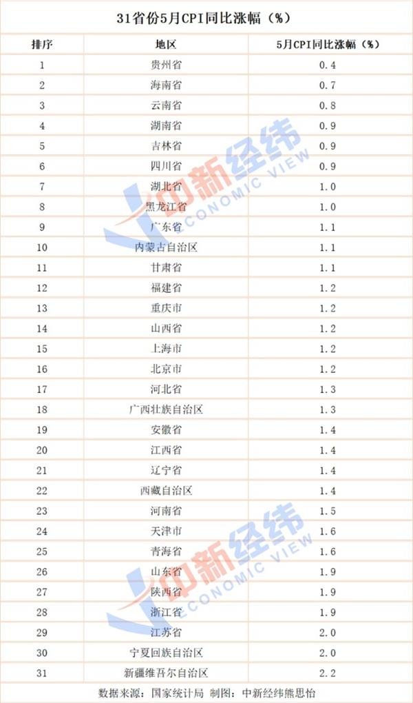 国家统计局11日公布31省份5月CPI数据,16省份5月CPI涨幅低于全国,贵州涨幅最低仅为0.4%。