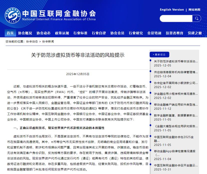 网络整理 2025-12-1412月5日,中国互联网金融协会、中国银行业协会、中国证券业协会、中国证券投资基金业协会、中国期货业协会、中国上市公司协会、中国支付清算协会等七家协会联合发布《关于防范涉虚拟货币等非法活动的风险提示》(以下简称《提示》)。《提示》特别提到,虚拟货币领域已成为传销、非法集资等非法活动的高发区,社会公众需高度警惕。