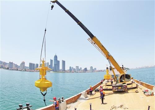 6月29日,工作人员将浮标式海洋环境在线监测系统投放在山东省烟台市芝罘湾海域。当日,首批4座浮标式海洋环境在线监测系统在山东省烟台市近海海域投放并投入使用。 唐 克摄 (新华社发)
