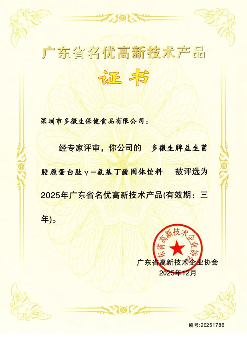 绿之韵数字化益生菌胶原蛋白肽γ-氨基丁酸固体饮料获评“广东省名优高新技术产品”